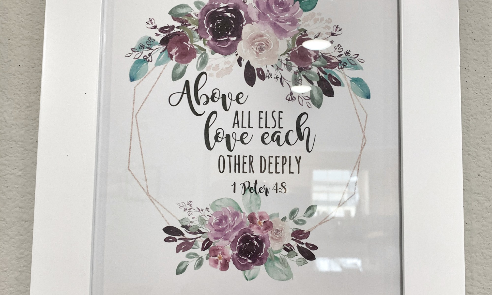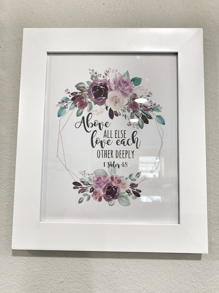 I finally framed these water color prints I bought on Etsy several months ago that the boys helped me to choose – scripture that we want to define our lives surrounded by water color paintings that delighted us for various reasons (the Philippians one reminds us of Colorado, where we vacation as families – we love our mountains!).