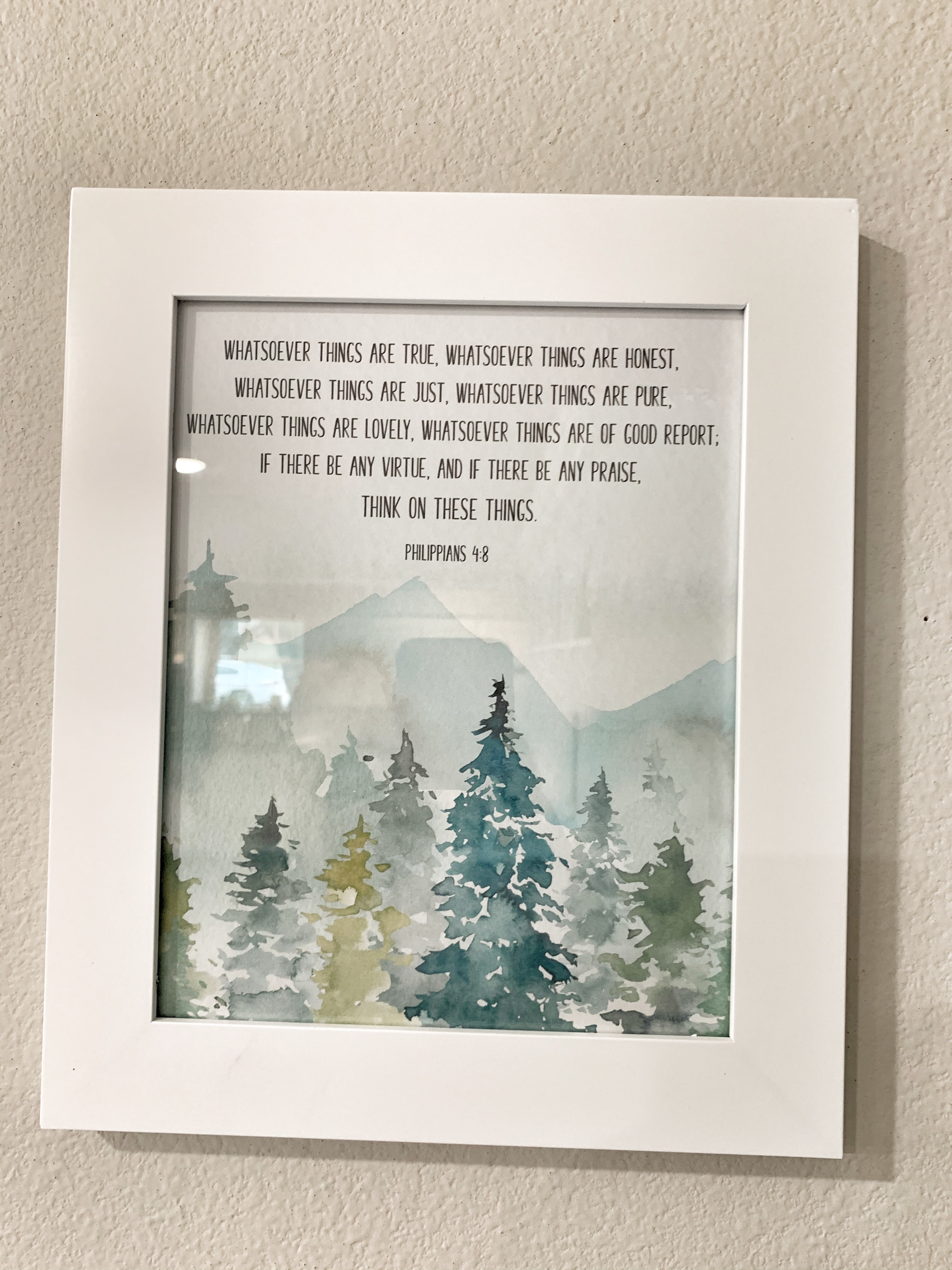 I finally framed these water color prints I bought on Etsy several months ago that the boys helped me to choose – scripture that we want to define our lives surrounded by water color paintings that delighted us for various reasons (the Philippians one reminds us of Colorado, where we vacation as families – we love our mountains!).