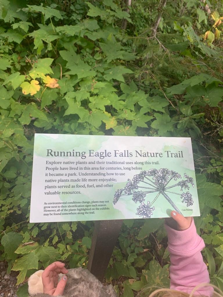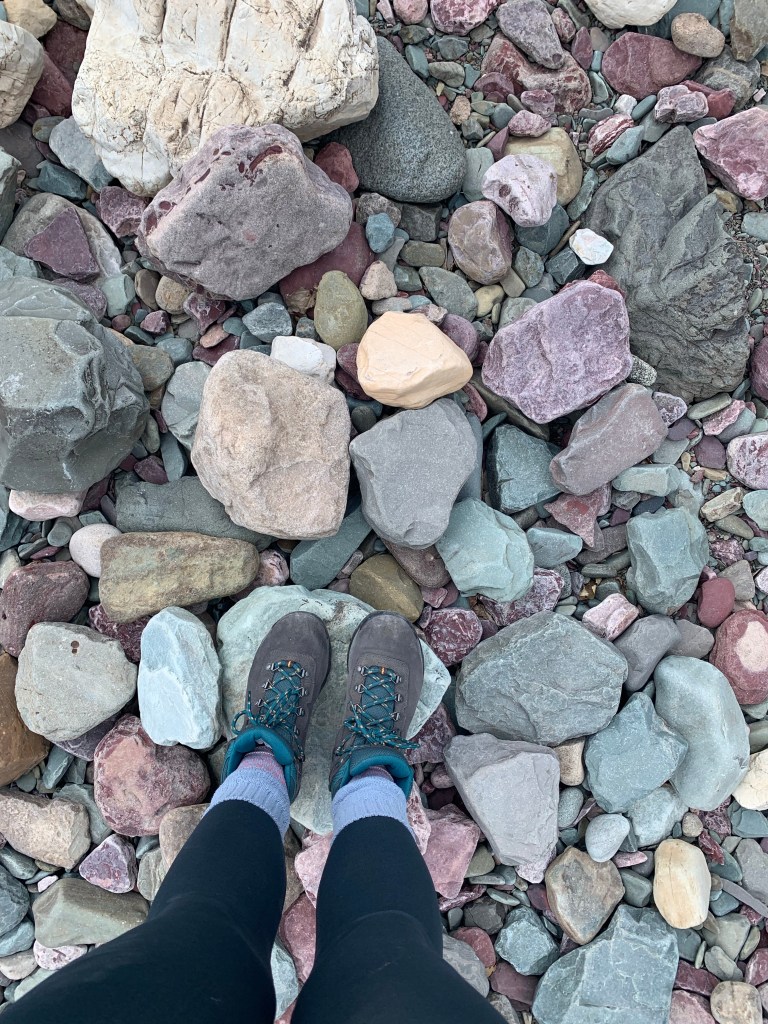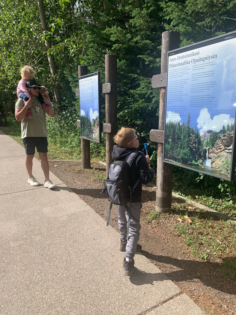 We didn’t begin this day quite as early since the previous day was so full, but we started out after breakfast and drove south an hour to the Two Medicine portion of GNP. I’d read that this is less populated with visitors and yet still just as pretty, and it was true! We stopped first at Running Eagle Falls and Nature Trail and enjoyed a flat, easy hike to some waterfalls and a river where the boys enjoyed skipping rocks (they’re pretty good at it!). The nature trail portion highlighted multiple plants and berries and their medicinal and practical uses – pretty interesting!