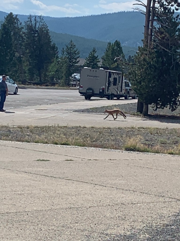 The timing was perfect! We found a parking spot for our rig easily, and at 3:45 walked up to see the next eruption predicted to be at 4:18, so we went into the general store and all got some ice cream to share, which we finished eating as we waited for the geyser. In between walks, we saw a fox loping across the parking lot!