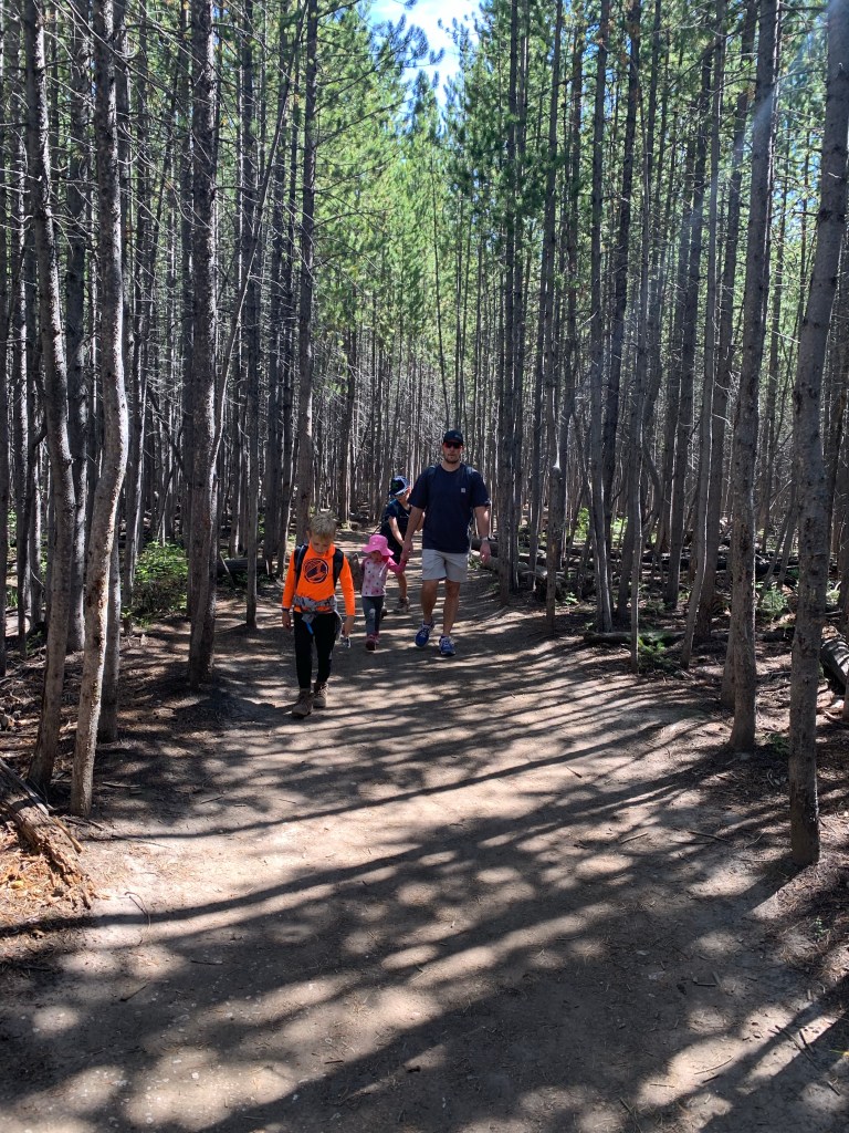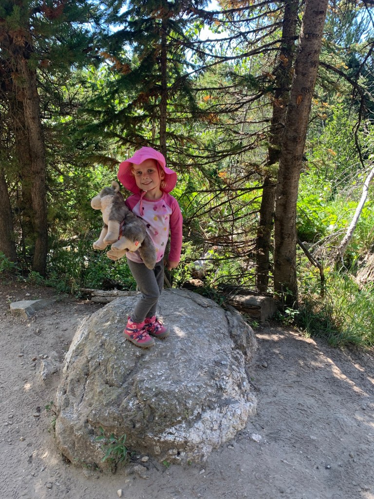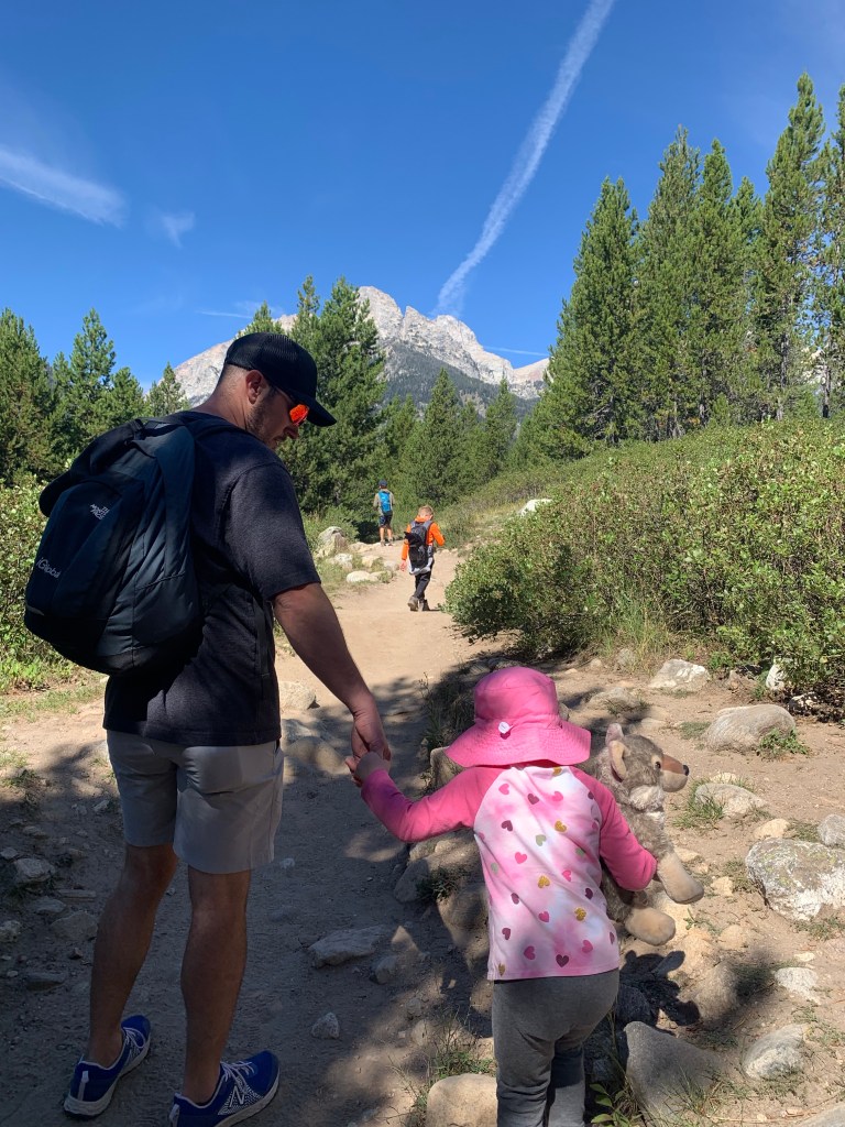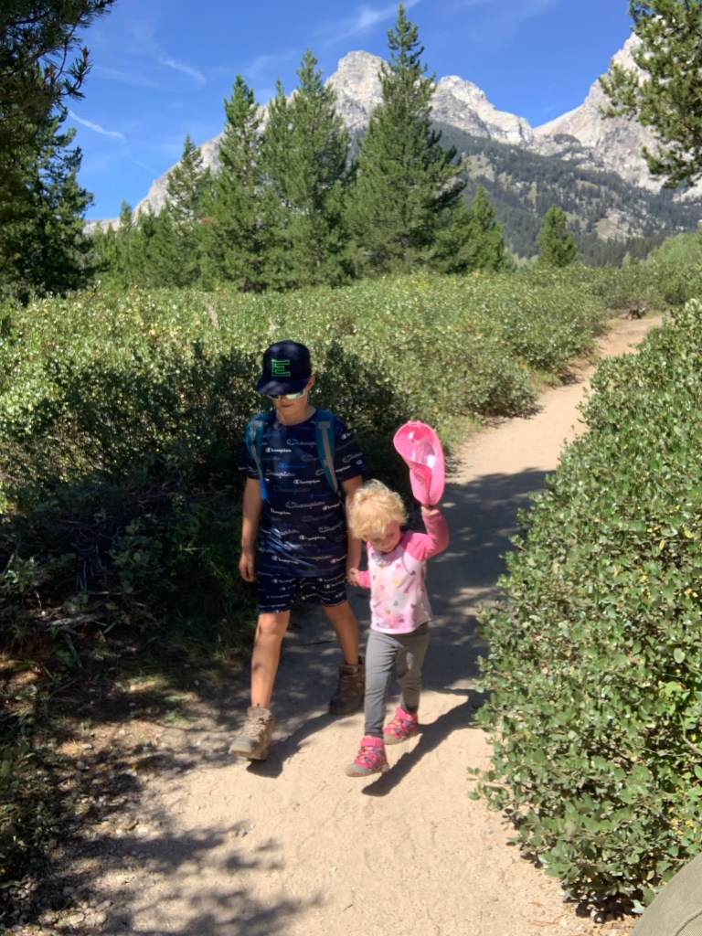 We then headed south in the Grand Teton National Park, not sure how far we would go, but playing it by ear as I had several trails marked along the main road. We ended up stopping at Taggart Lake Trailhead and making a three mile round trip hike! It was a good adventure for us, and ended at Taggart Lake with a beautiful view of the Teton mountain ridge.