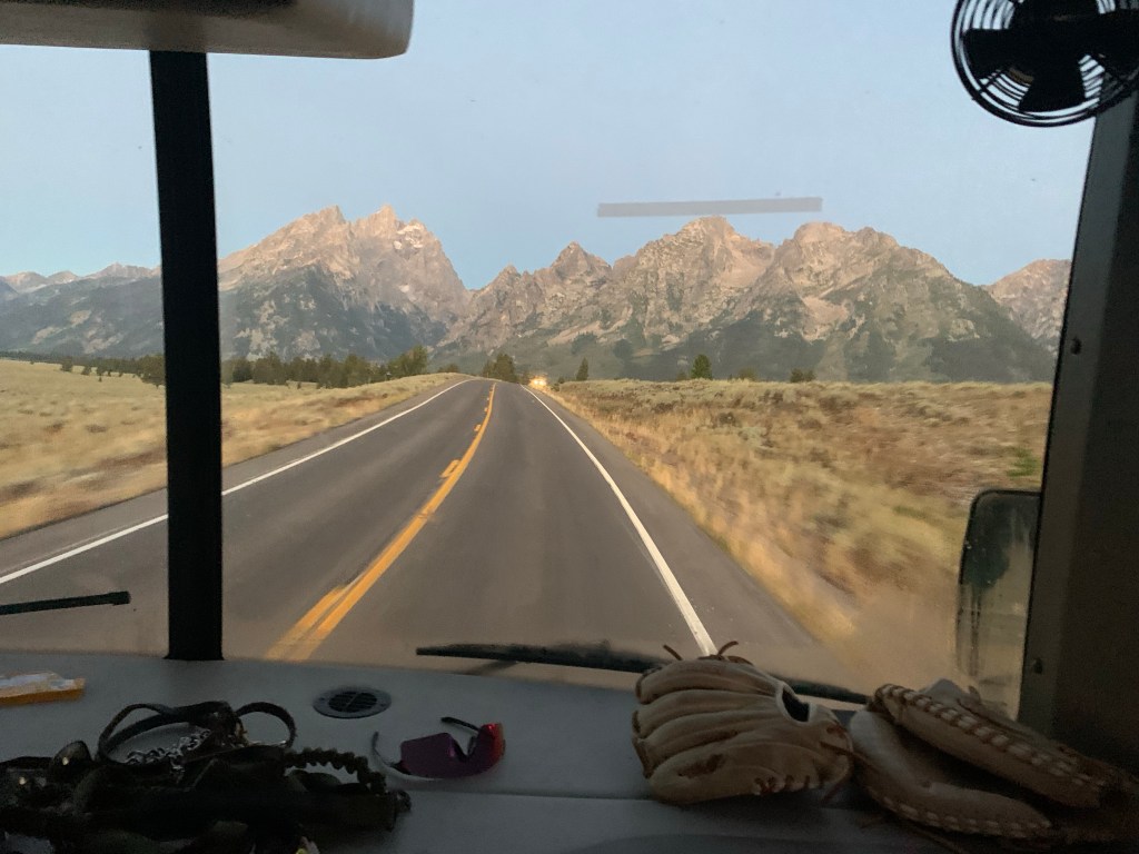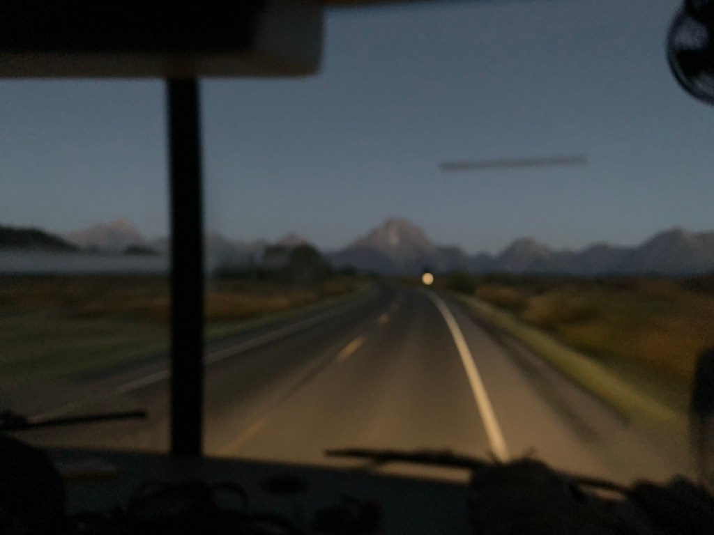 We enjoyed the sunrise as we drove south through the Grand Teton National Park one last time. We then had a pretty smooth day of driving, with lots of mountain passes, but Nick drove it all so well! He even crossed the bridge in the picture below without scraping the RV on either side! It was the tightest squeeze we’ve ever had to make, I think!