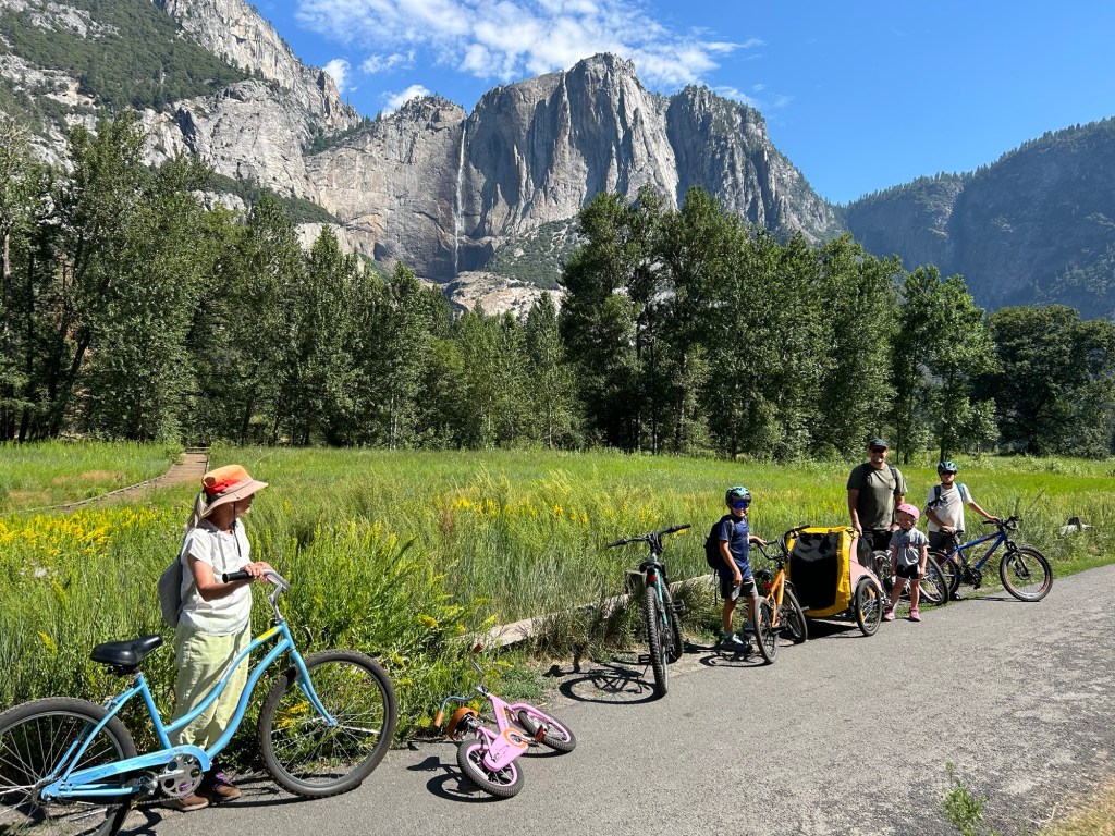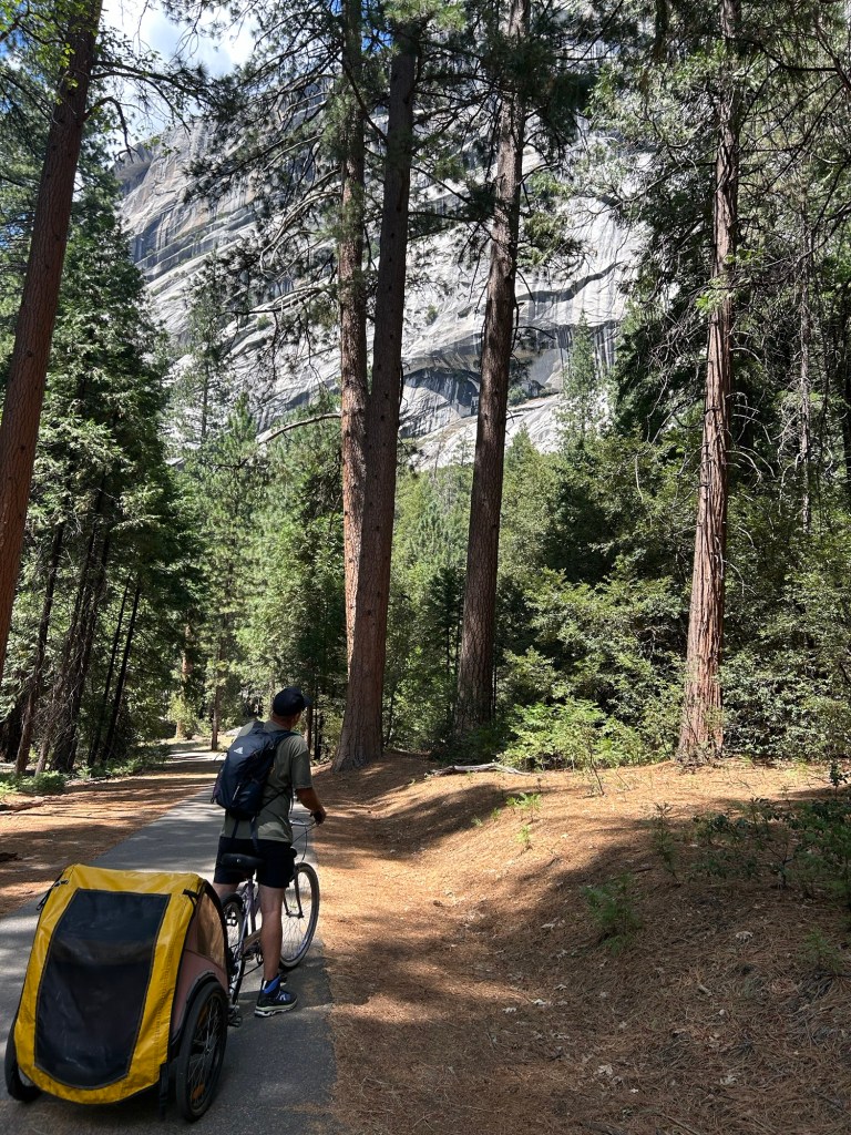 It then took us a good bit to get to Yosemite Lodge as we tried to navigate the roads and maps. We took a wrong turn and doubled back (this will all be easier someday if we ever return! ha), but finally made it to the bike rental at Yosemite Lodge, which was less crowded, for sure. I wish we had started there. Thankfully, they still had trailers available! So we grabbed our rentals and returned to the car with the good news!