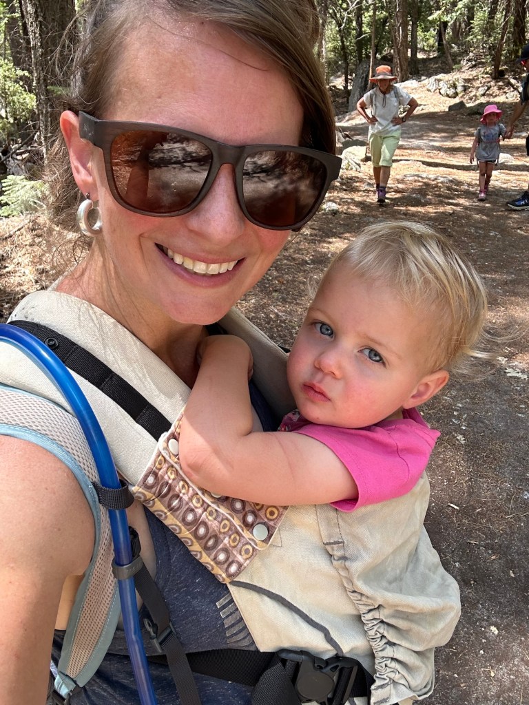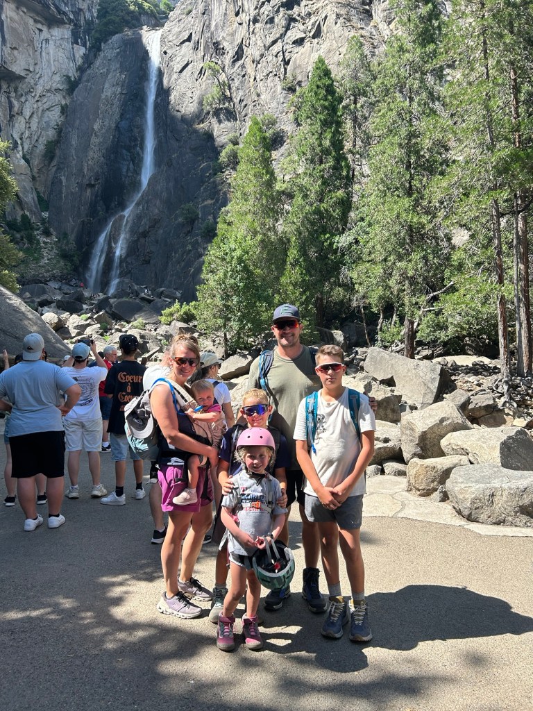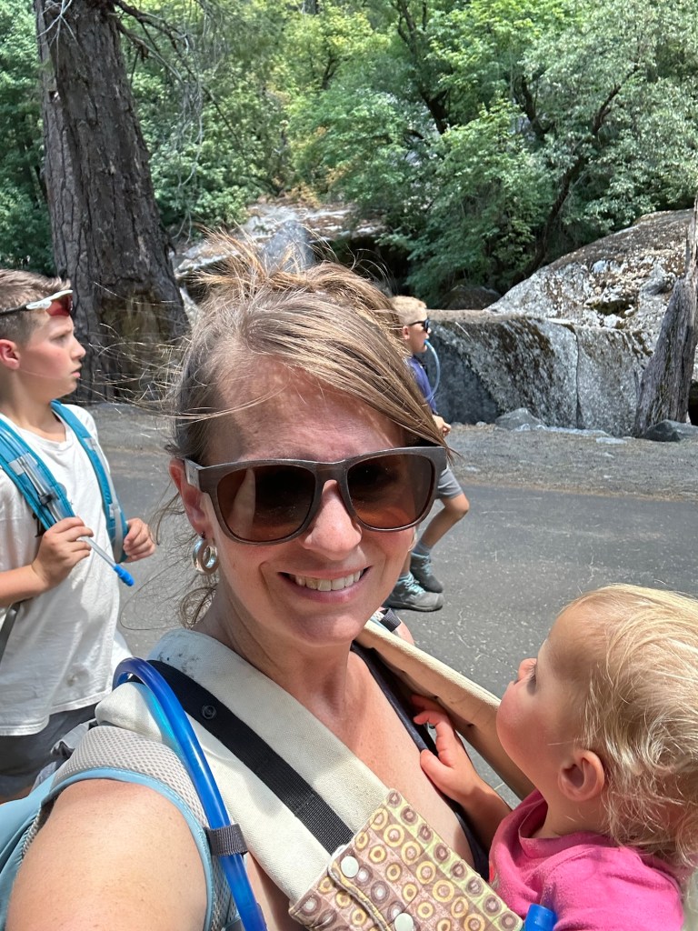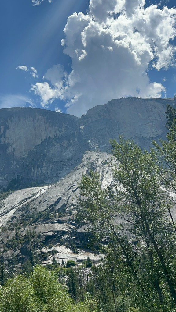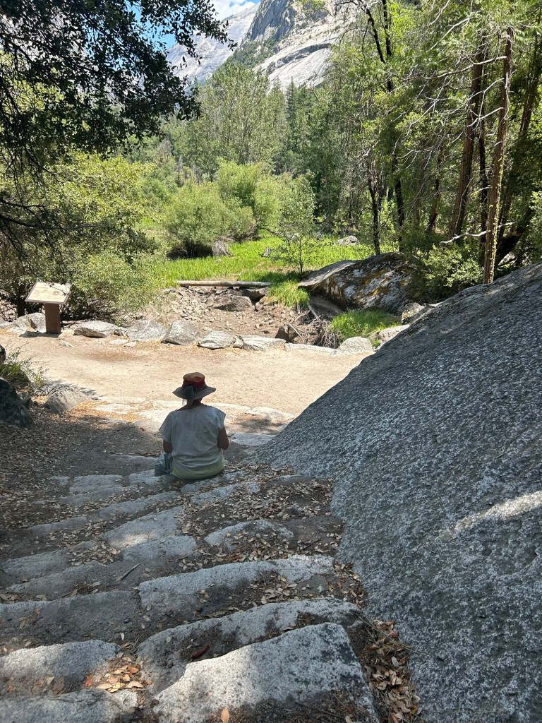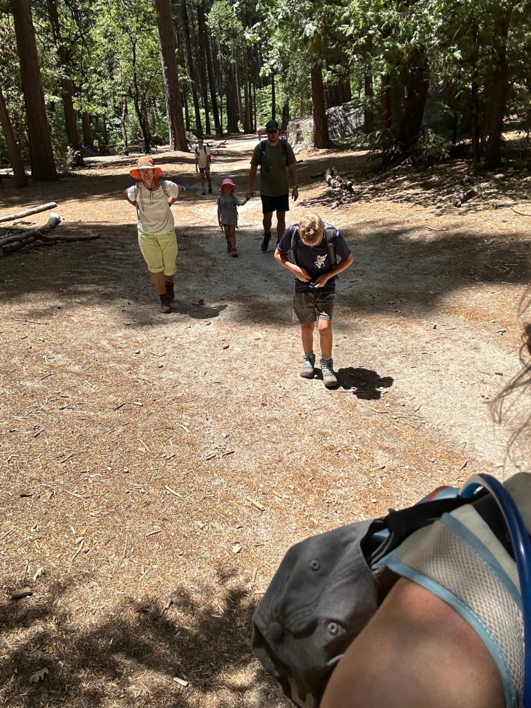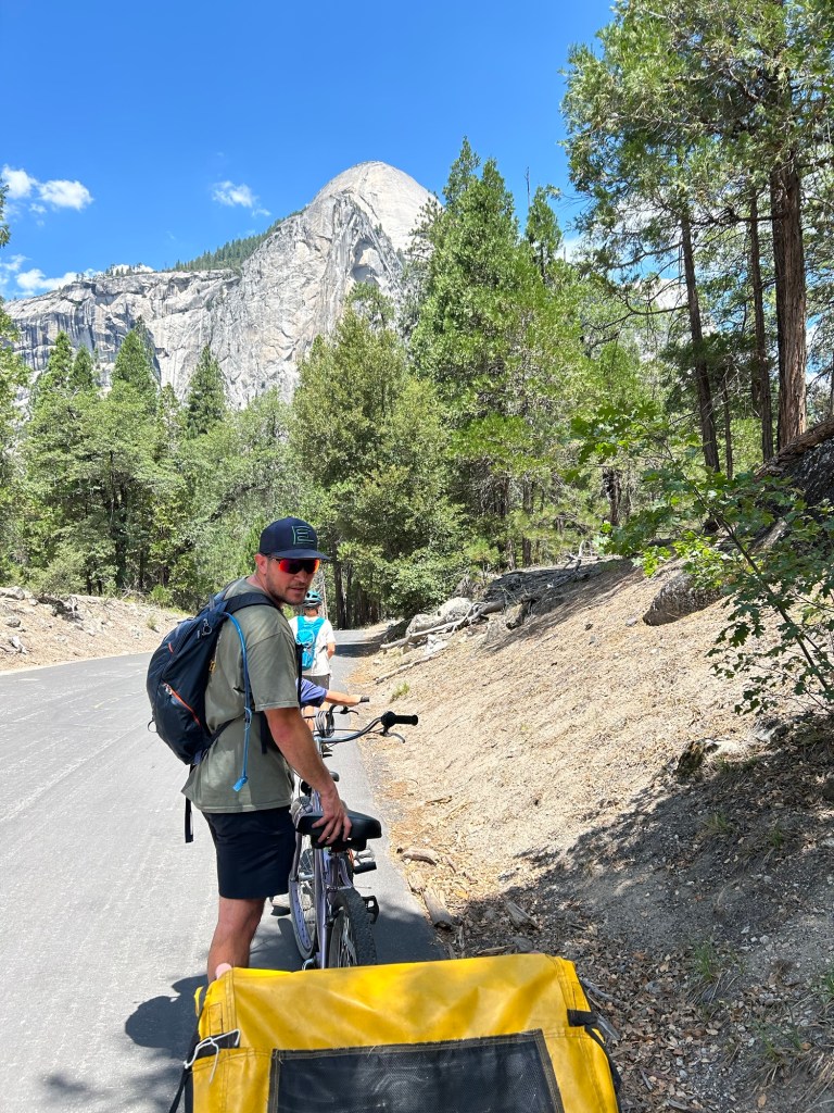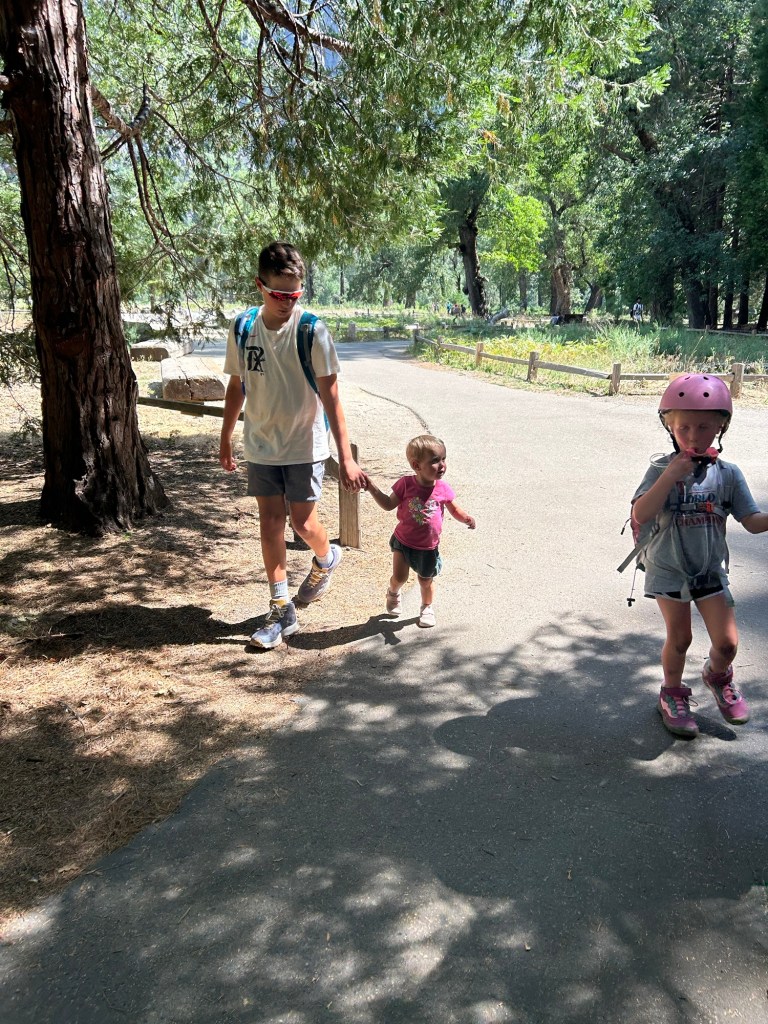 It was so great to return to the bikes, and we then rode our longest stretch, all the way back to Yosemite Lodge. We intended to stop at Lower Falls and hike there, but right when we passed A— Hotel, Nick’s bike threw the same chain again, so he had to walk it with the trailer the remaining 2 miles to the bike rental store, which meant we passed Lower Falls – everyone needed a refill on water and, as Carmen put it, a bathroom that wasn’t a hole in the ground. Ha!