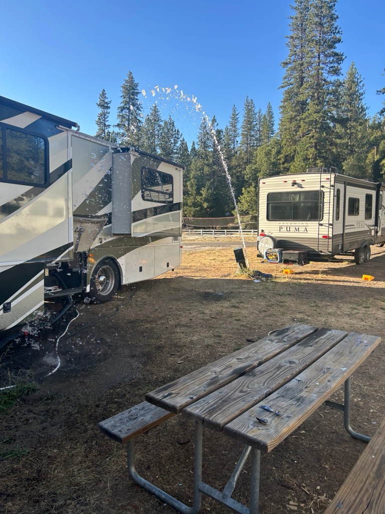 One adventure back at our RV park included Nick watching someone back their trailer into the water hookup at a site, causing it to explode with water for about ten minutes before maintenance cut the water off to fix it. Surrounding families had to pack up rugs, chairs and other outdoor items in order to avoid the flood of water rushing downhill and through multiple sites. He got a video of it – it was quite the entertainment for a bit!
