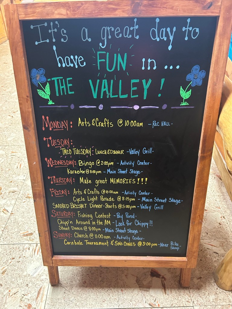 Fun Valley is a great, restful way to end any trip. We literally don’t leave the park. We sleep later, eat way too many fried pies for every meal (from a local Amish community who delivers to FV), grill, fish, rent and ride bikes (I got a tag along for K), pedal board, play putt putt, enjoy the playground and lounge around a fire a lot! The girls swam and played in the river some, we played dominoes, the boys enjoyed several sports with other campground kids, Pappaw and Nick taught the boys strategy with playing pool, and the rest of us enjoyed the free train ride around the campground.